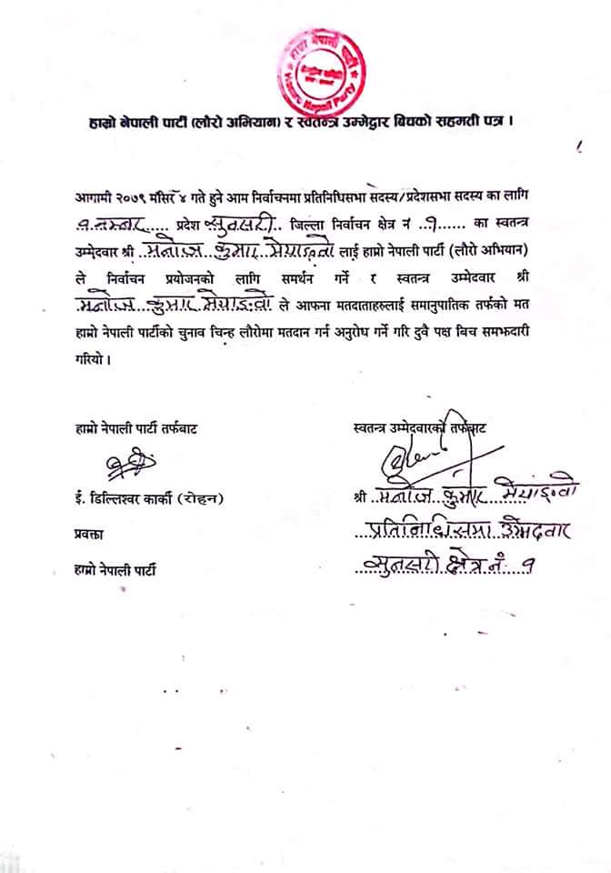 मनोज मेन्याङ्बो र हाम्रो नेपाली पार्टीबीच भएको सहमति हेर्नुहोस्