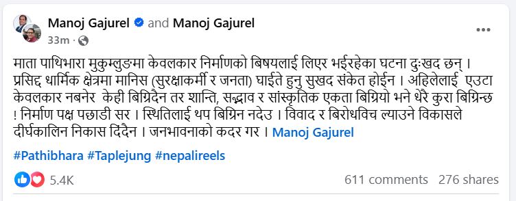 केबलकारकाे विषयलाई लिएर ताप्लेजुङमा हरेक दिन नो केबलकार पक्ष र प्रहरीबिच हिंसात्मक घटनाहरू हुन थालेपछि गजुरेलले सामाजिक सञ्जालमा लेख्दै सरकारको ध्यानाकर्षण गराएका हुन् ।