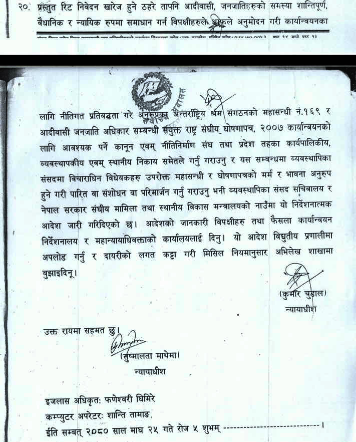 सर्वोच्च अदालतले अन्तर्राष्ट्रिय श्रम संगठन (ILO) महासन्धि नं. १६९ तथा आदिवासीहरूको अधिकार सम्बन्धी संयुक्त राष्ट्रसंघीय घोषणापत्र (UNDRIP) कार्यान्वयन गर्न सरकार र संसदलाई निर्देशनात्मक आदेश दिएको छ ।