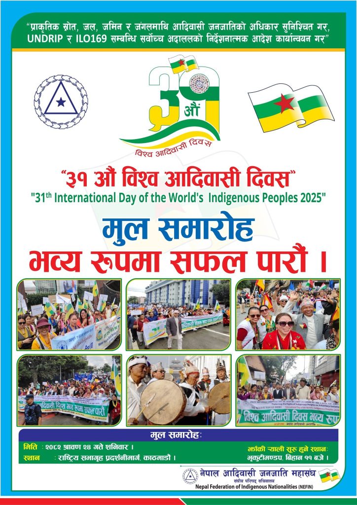 नेपालमा यस वर्ष नेपाल आदिवासी जनजाति महासंघले ‘प्राकृतिक स्रोत, जल, जमिन र जंगलमाथि आदिवासी जनजातिको अधिकार सुनिश्चित गर, युएनड्रिप र आईएलओ १६९ सम्बन्धी सर्वोच्च अदालतको निर्देशनात्मक आदेश कार्यान्वयन गर’ भन्ने नारासहित ३१औं विश्व आदिवासी दिवस मनाउँदैछ।