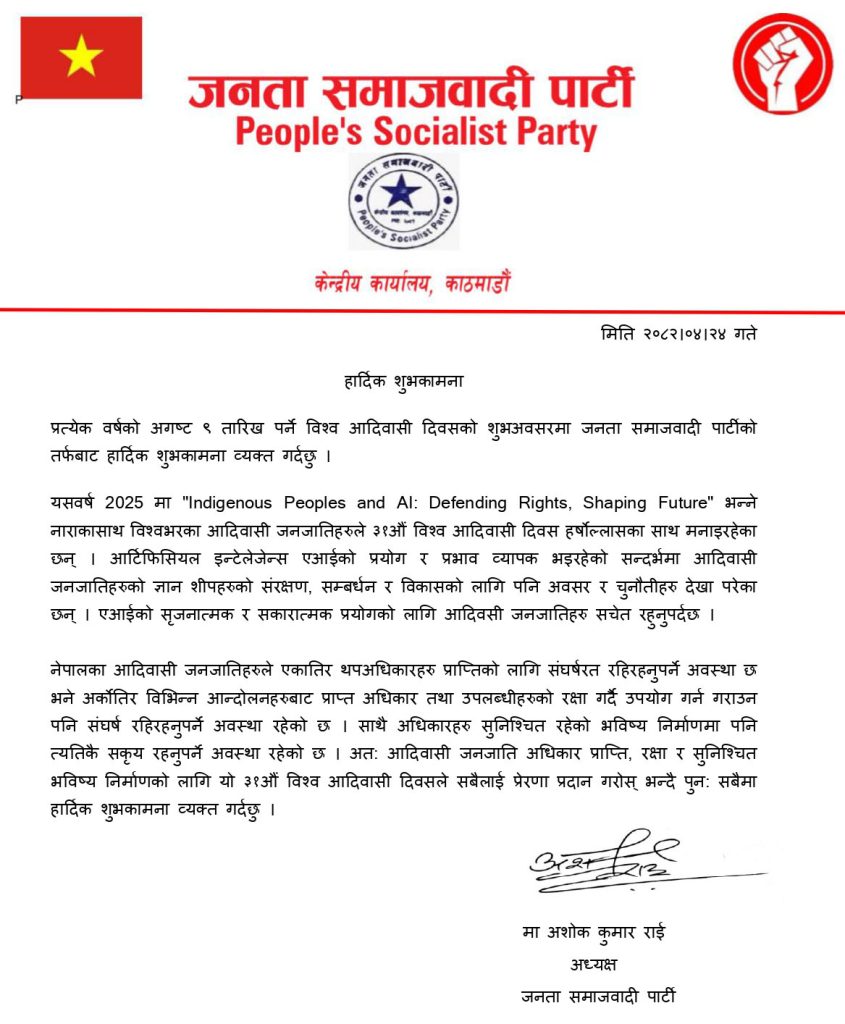 जनता समाजवादी पार्टीका अध्यक्ष अशोक राईले ३१औं विश्व आदिवासी दिवसको शुभकामना दिँदै आर्टिफिसियल इन्टेलिजेन्स (एआई)को सिर्जनात्मक र सकारात्मक प्रयोगका सम्बन्धमा आदिवासी जनजातिहरू सचेत हुनुपर्ने बताएका छन्।