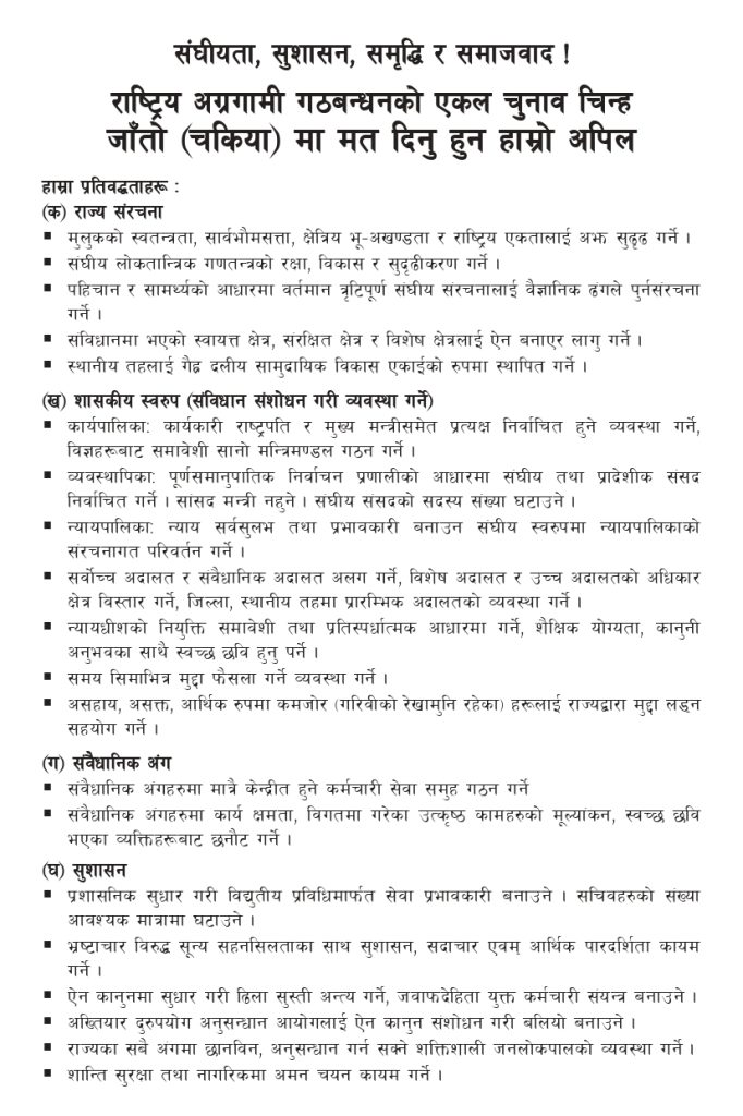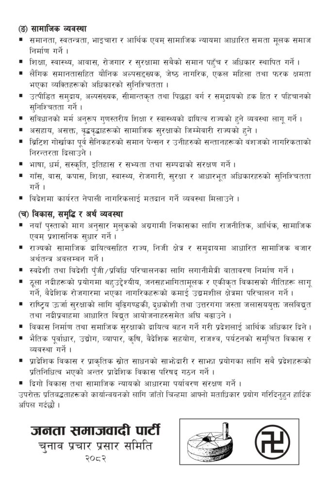 काठमाडौँ। जाँतो चुनाव चिन्ह लिएर निर्वाचनमा होमिएको जनता समाजवादी पार्टी (जसपा) ले पहिचानसहितको संघीयता, प्रत्यक्ष निर्वाचित कार्यकारी राष्ट्रपति, विज्ञहरूबाट मन्त्रिमण्डल गठन गर्ने लगायतका प्रतिबद्धता जनाएको छ।