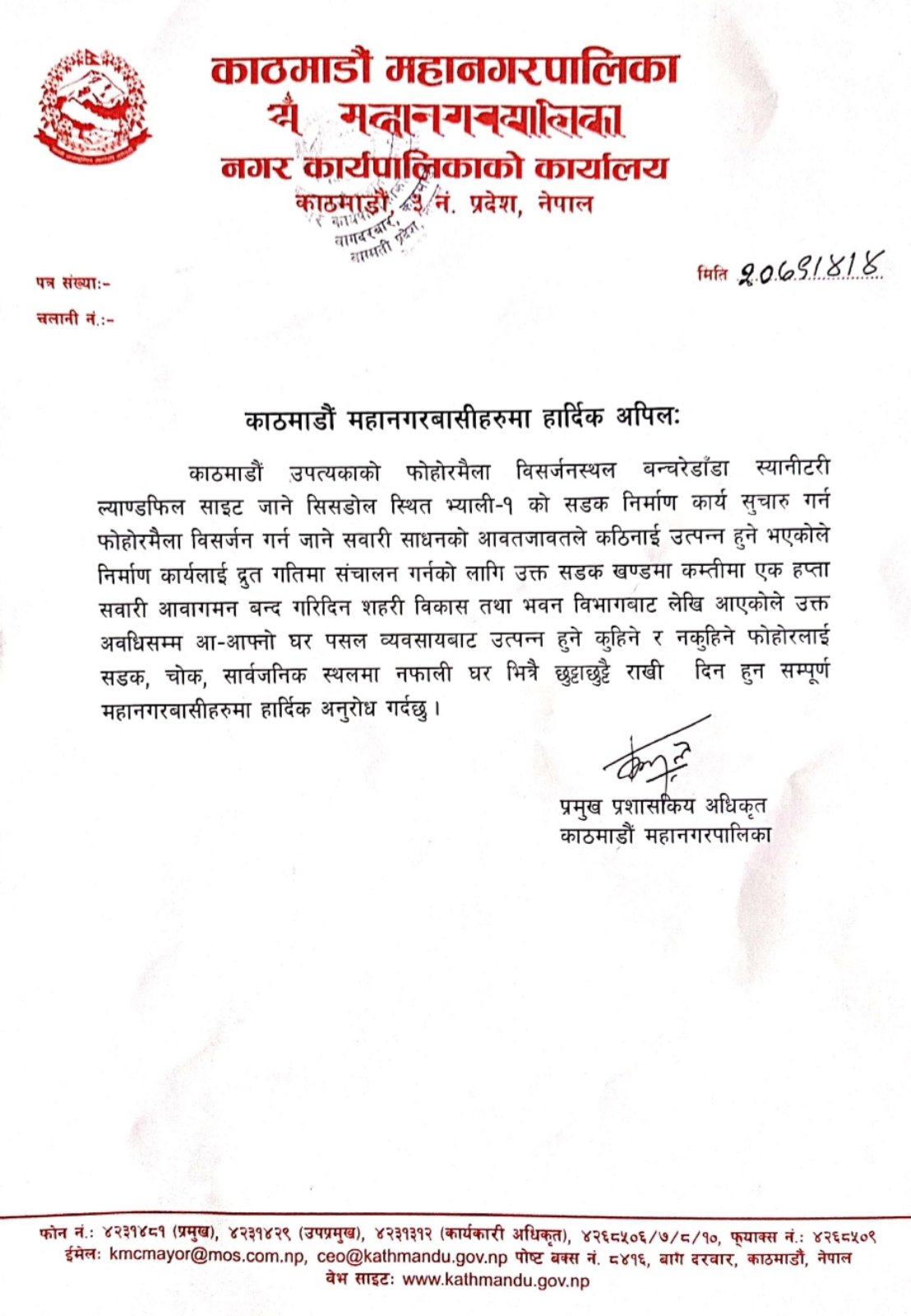 फाेहाेर व्यवस्थापन गर्ने बन्चरेडाँडा स्यानीटरी ल्याण्डफिल साइट जाने सिसडोलस्थित भ्याली–१ को सडक निर्माण कार्य भइरहेकाले तत्काल फोहोर उठ्ने भएकाे हाे ।