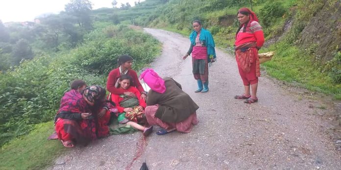 बारेकोट गाउँपालिका–३ पहाडा मुल्सामकी २१ वर्षीया मिना नेपालीलाई सुत्केरी बेथाले च्यापेपछि छ घण्टा हिँडेर प्राथमिक स्वास्थ्य केन्द्र लिम्सामा ल्याउँदै गर्दा बाटोमै सुत्केरी ।