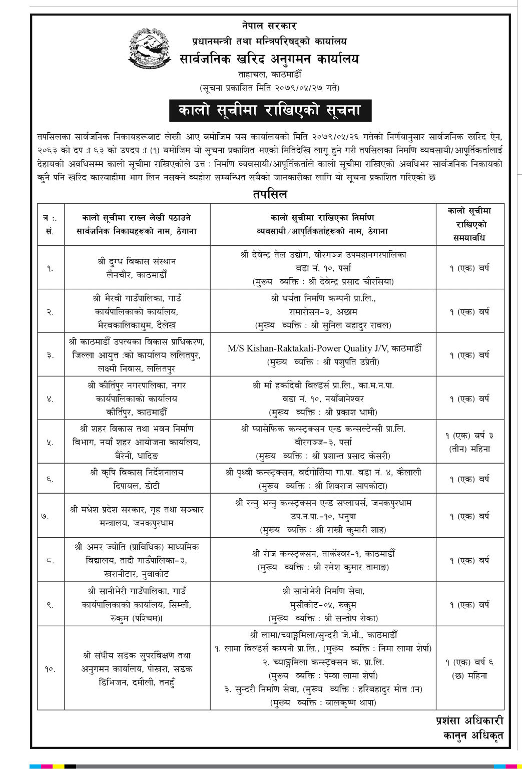 प्रधानमन्त्री तथा मन्त्रीपरिषद्को कार्यालयले हिजाे सूचना प्रकाशन गर्दै कालोसूचीमा पर्ने १० वटा कम्पनी र ठेकेदारको नाम सार्वजनिक गरेको हाे ।