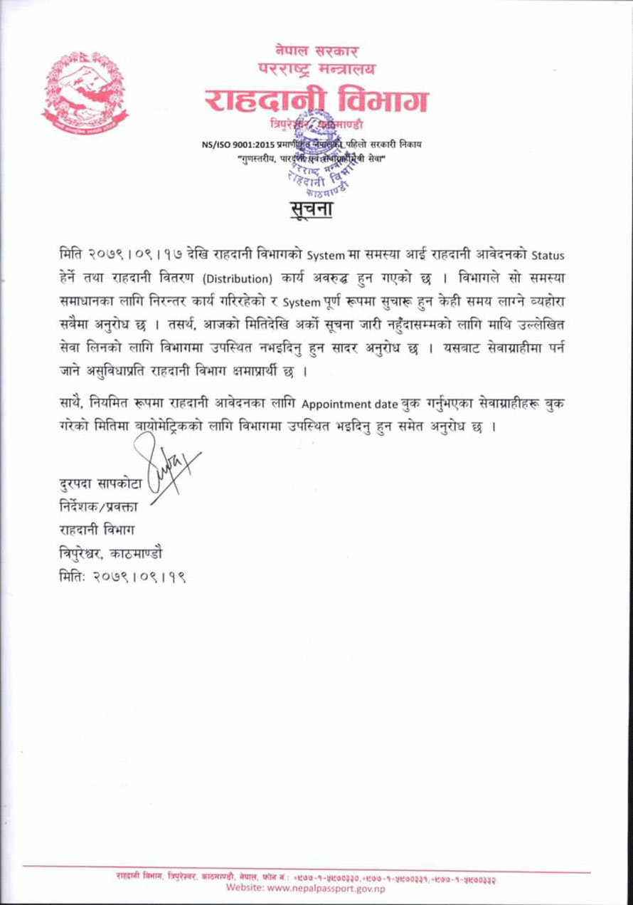 विभागका प्रवक्ता एवम् निर्देशक द्रुपदा सापकोटाले अर्को सूचना जारी नहुँदासम्मका लागि राहदानी लिन नआउन सेवाग्राहीलाई आग्रह गरेका छन् ।