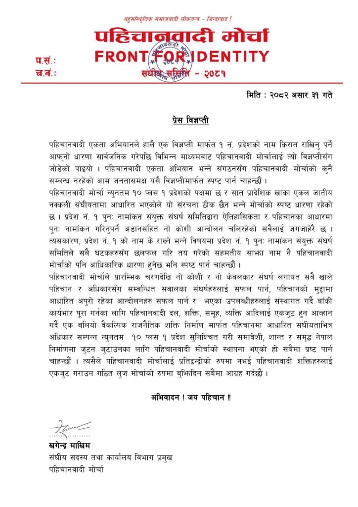 मोर्चाका संघीय सदस्य तथा कार्यालय प्रमुख खगेन्द्र माखिमले मंगलबार एक प्रेस विज्ञप्ति जारी गर्दै पहिचानवादी एकता अभियानसँग आफूहरूको कुनै सम्बन्ध नरहेको प्रष्ट पारेका हुन् ।