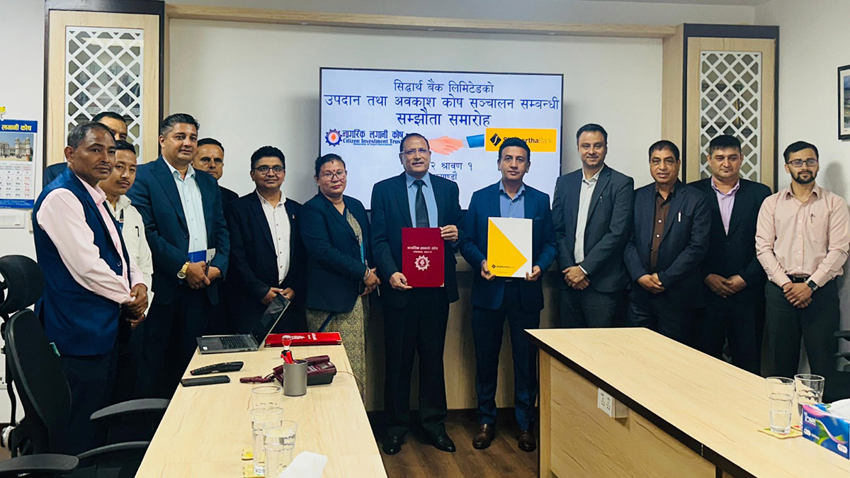 काठमाडाैं – नागरिक लगानी कोष र सिद्धार्थ बैंक लिमिटेडबीच उपदान तथा अवकाश कोष सञ्चालनसम्बन्धी सम्झौता सम्पन्न भएको छ।