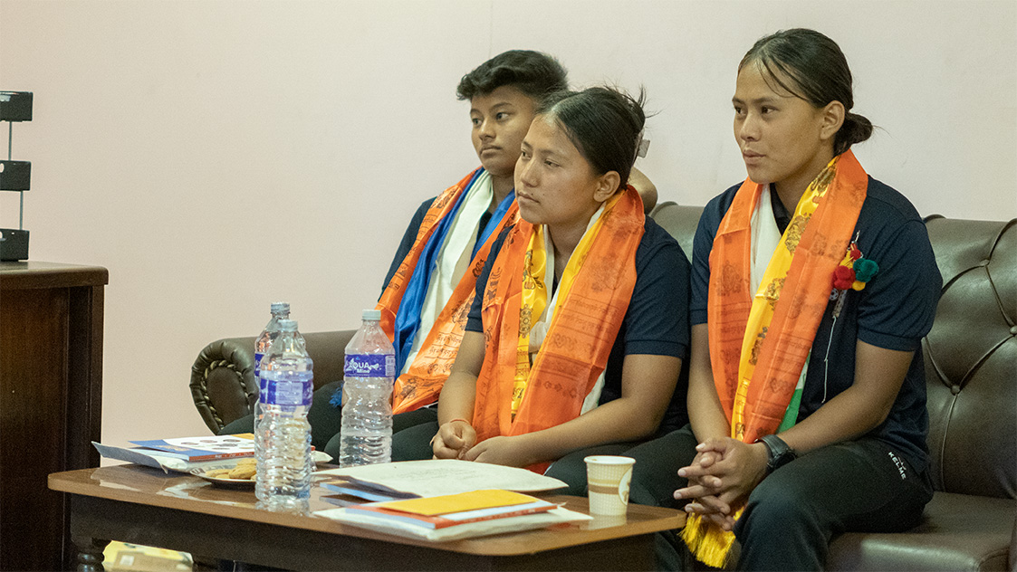 यू–२० महिला फुटबल खेलाडीहरू बायाँबाट पूर्णिमा राई, अनिशा राई र सिम्रन राई।