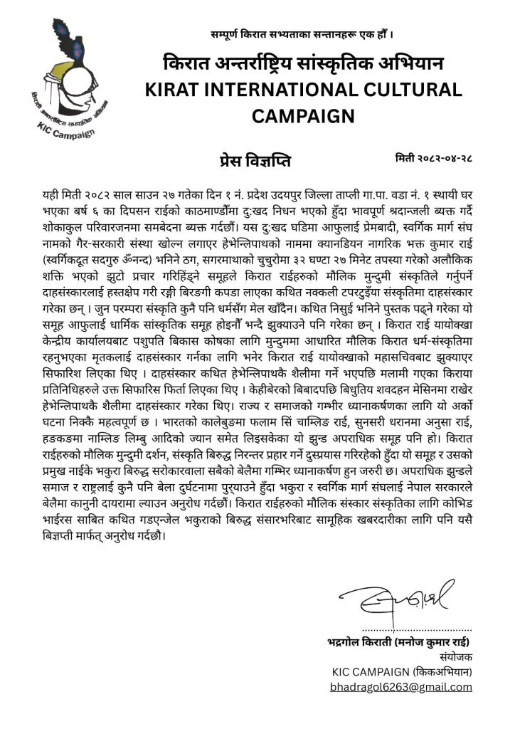 विज्ञप्तिमा यस प्रकारका कार्यहरूले मौलिक किराती संस्कारमाथि अतिक्रमण हुने चेतावनी दिँदै सबैलाई यसबारे गम्भीर हुन आग्रह गरिएको छ।