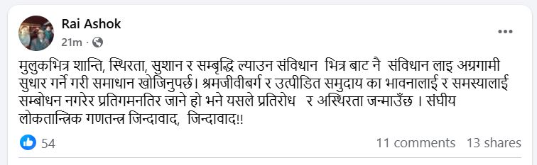 ‘मुलुकमा शान्ति, स्थिरता, सुशासन र समृद्धि ल्याउन संविधानभित्रबाटै अग्रगामी सुधार गर्दै समाधान खोजिनुपर्छ,’ बिहीबार बिहान उनले फेसबुकमा लेखेका छन्, ‘श्रमजीवी र उत्पीडित समुदायका भावना र समस्यालाई सम्बोधन नगरेर प्रतिगमनतर्फ गए प्रतिरोध जन्मिन्छ। संघीय लोकतान्त्रिक गणतन्त्र जिन्दावाद।’