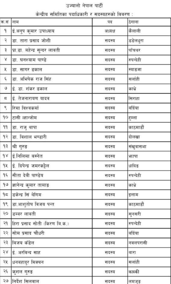 ऊर्जामन्त्री कुलमान घिसिङको नेतृत्वसँग जोडिएको भनिएको ‘उज्यालो नेपाल पार्टी’ ले मंगलबार निर्वाचन आयोगमा पार्टीको विधान तथा ५१ सदस्यीय केन्द्रीय समितिको नामावली बुझाएको छ।