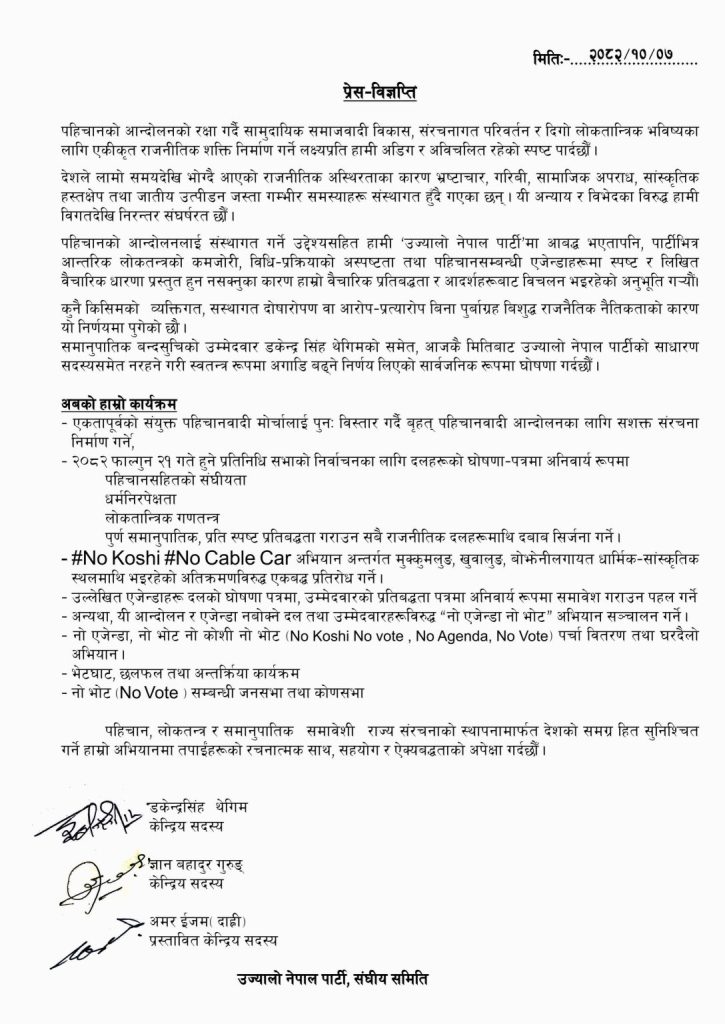 उनीहरूले पहिचानको मुद्दालाई पार्टीले स्पष्ट तथा लिखित रूपमा प्रस्तुत नगरेको भन्दै बुधबार संयुक्त प्रेस विज्ञप्ति जारी गर्दै पार्टी परित्याग गरेका हुन्।