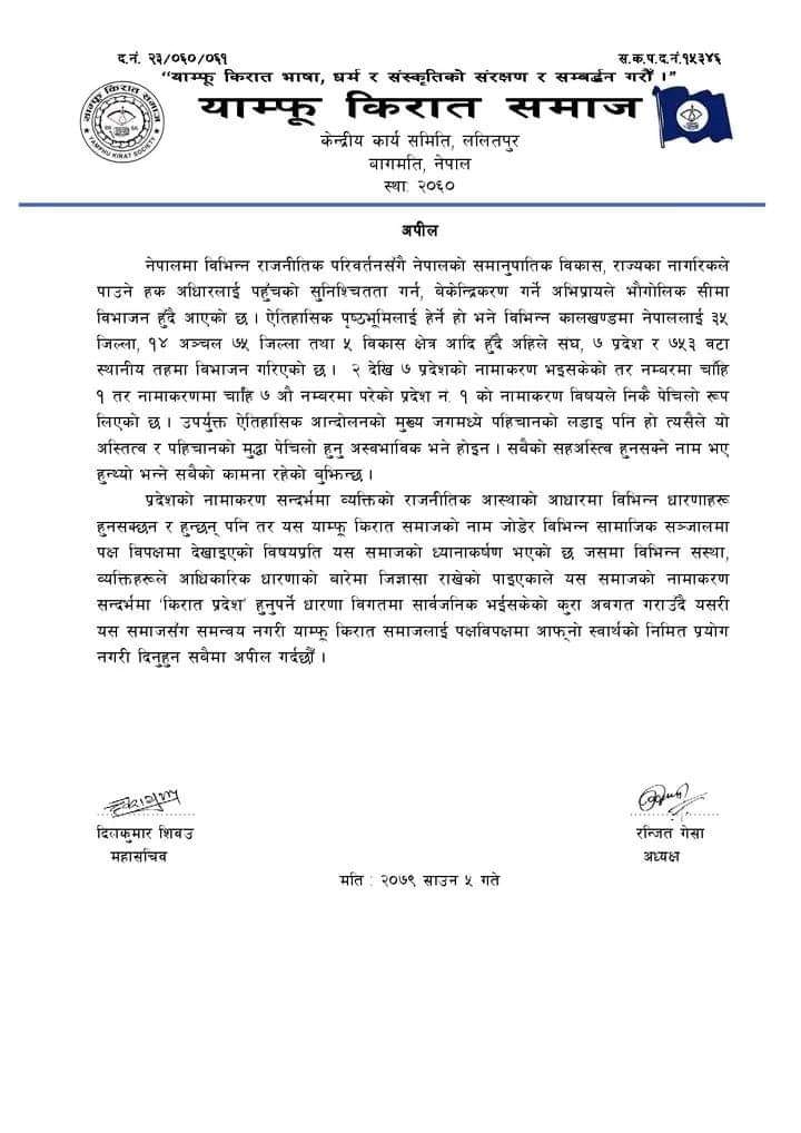 ‘प्रदेश नामकरणको सन्दर्भमा व्यक्तिको राजनीतिक आस्थाको आधारमा विभिन्न धारणाहरु हुन सक्छन्, तर याम्फू किरात समाजको नाम जोडेर विभिन्न सामाजिक सञ्जालमा पक्ष विपक्ष देखाइएको विषयप्रति समाजको ध्यानाकर्षण भएको छ,’ अपिलपत्रमा भनिएको छ, ‘जसमा विभिन्न संस्था र व्यक्तिहरुले आधिकारिक धारणाको बारेमा जिज्ञासा राखेको पाइएकोले यस समाजको नामकरणको सन्दर्भमा किरात प्रदेश हुनुपर्ने धारणा विगतमा सार्वजनिक भइसकेको कुरा अवगत गराउँदै यसरी समाजसँग समन्वय नगरी याम्फू किरात समाजलाई पक्षविपक्षमा आफ्नाे स्वार्थको निमित्त प्रयोग नगरीदिन हुन सबैमा अपिल गर्दछौं ।’