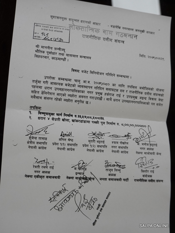 धरानको समग्र विकासमा पहल गर्न तथा चालू आर्थिक वर्षमै सुरु हुने गरी थप नयाँ योजनाहरु ल्याउनका निम्ति नगरका मेयर–उपमेयर मात्रै नभएर नेपाली कांग्रेस, नेकपा माओवादी केन्द्र, जनता समाजवादी पार्टी र नेकपा एकीकृत समाजजादीका नेताहरु नै लागेका छन् ।