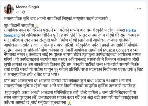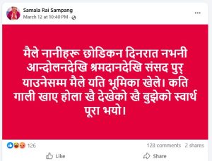 उनले फेसबुकमा लेखेकी छन्, ‘मैले नानीहरू छोडेर दिनरात नभनी आन्दोलन र श्रमदानमा भूमिका खेलेँ। कति गाली खाएँ होला, खै देखेको?’