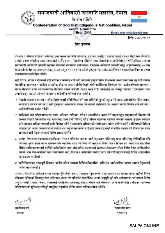 पार्टीभित्र संकट पैदा भएपछि महासंघले आदिवासी जनजाति समुदायका ७० जनाभन्दा बढी केन्द्रीय सदस्यहरुकाे यही फागुन १० र १२ गतेकाे बृहत् छलफल र समझदारी गरी सो अनुसारको धारणा वक्तव्यमार्फत सार्वजनिक गरेको हो ।