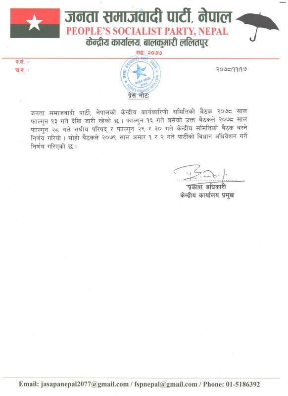 जसपाका केन्द्रीय कार्यालयका प्रमुख प्रकाश अधिकारीले हिजो प्रेस नोट जारी गरी बैठकको निर्णय सार्वजनिक गरेका हुन् ।