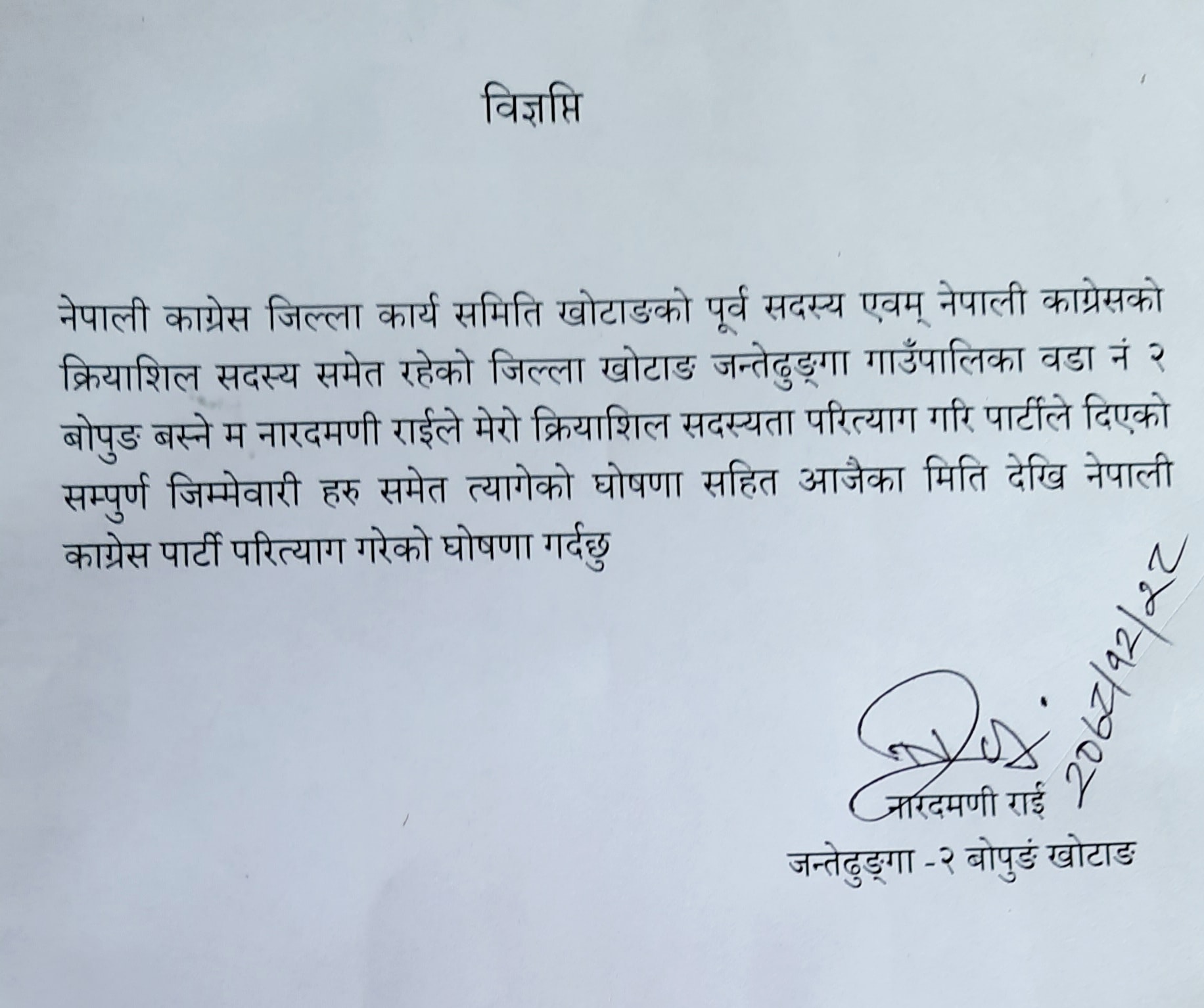 जन्तेढुंगा गाउँपालिका वडा नं २ बोपुङ घर भएका बान्तावाले आज एक विज्ञप्ति जारी गरी कांग्रेस परित्याग गरेको जनाएका हुन् ।